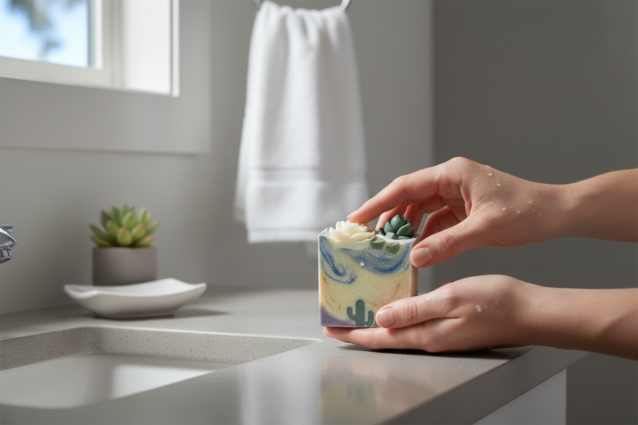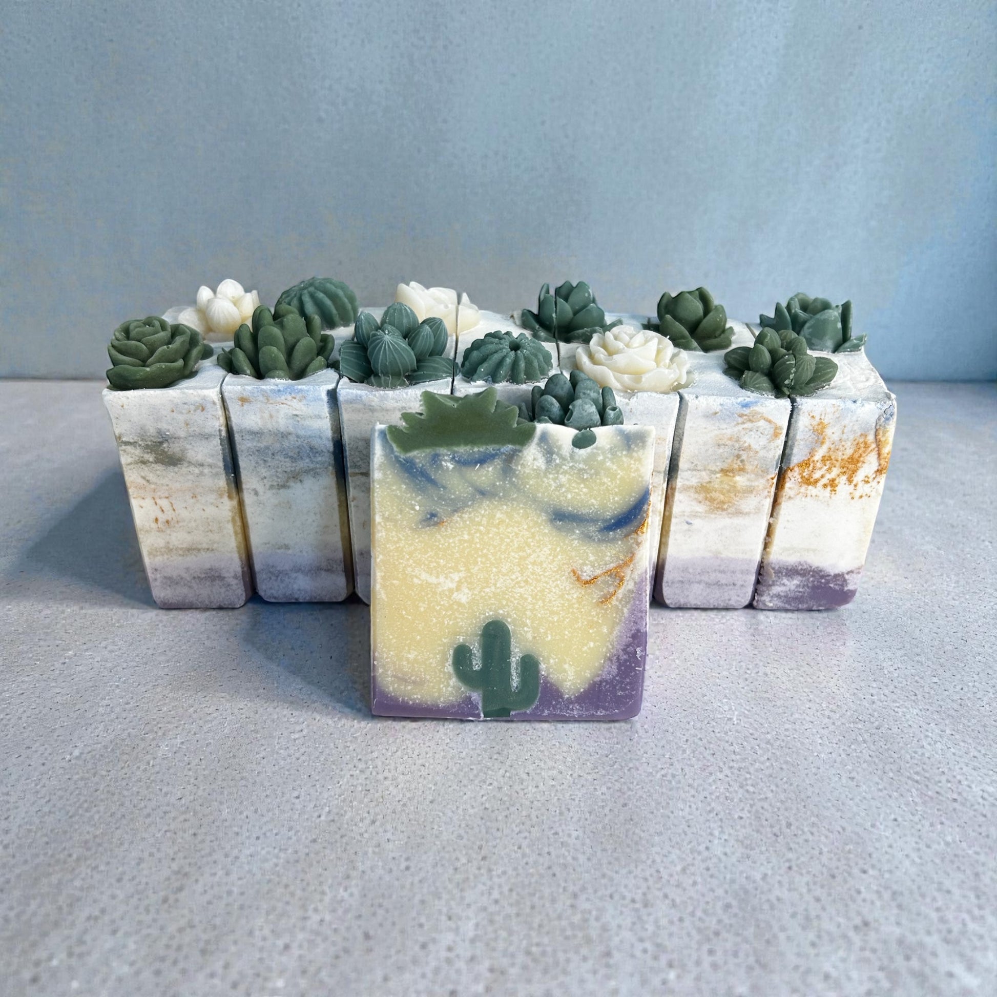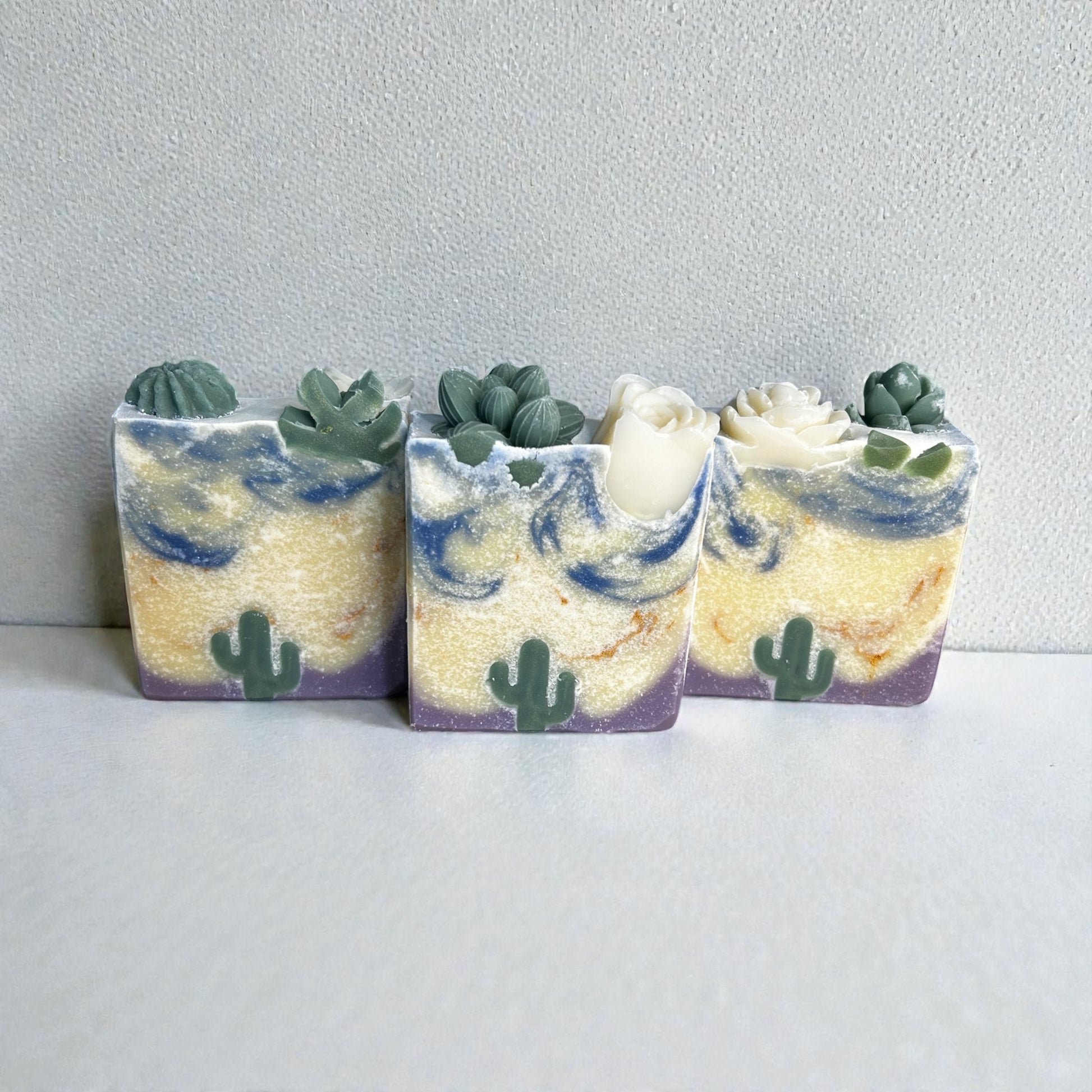 Each bar features a desert landscape design with cactus details, making it as beautiful as it is functional. Perfect for daily use on hands and body, this soap is ideal for dry or sensitive skin and for anyone who loves nature-inspired, artisan soap.