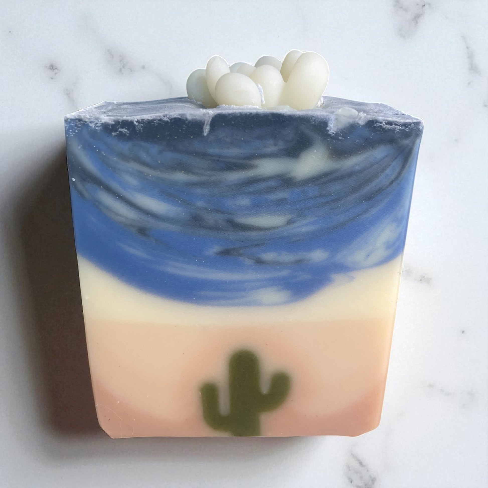 Experience the serenity of the desert at sunset with our Desert Bloom Bars. Handcrafted by Yellow Lark Soap Co., this artisan soap features a dreamy cactus landscape design topped with delicate succulent accents. Scented with a soothing blend of lavender, lemongrass, and frankincense essential oils, this bar offers a calming yet refreshing wash that nurtures both skin and spirit. Perfect for those who love nature-inspired skincare, each bar transforms your daily routine into a desert spa ritual. Gentle, moisturizing, and long-lasting, this soap makes a beautiful gift or a self-care essential.