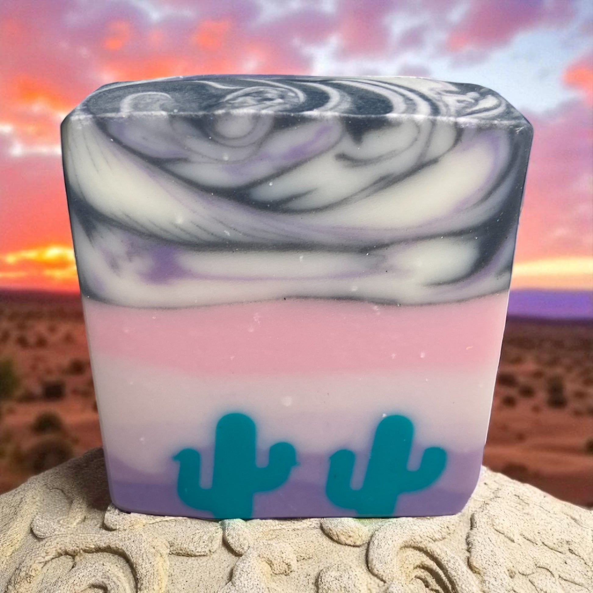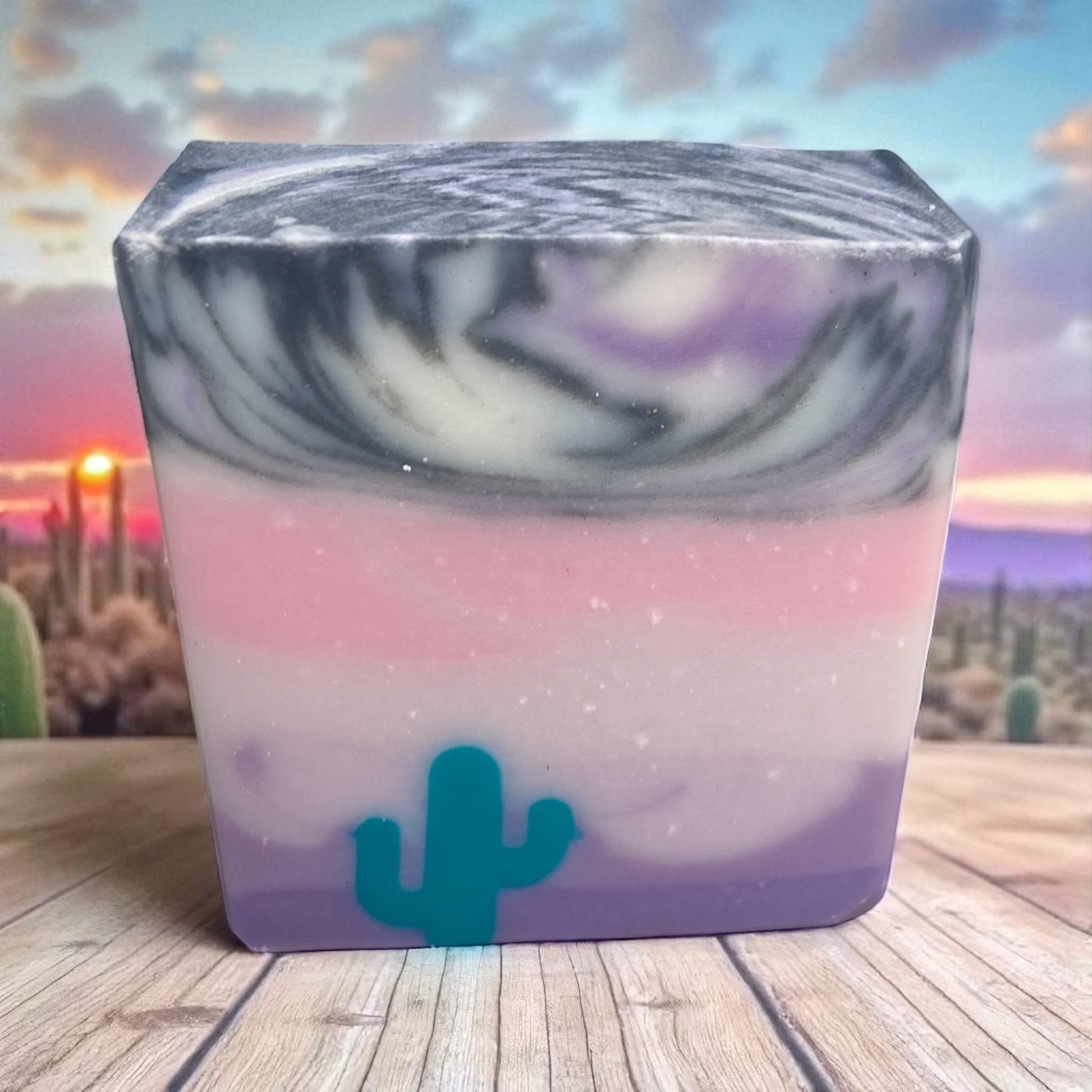 Drift into calm with Desert Daydream, a handcrafted artisan soap inspired by the peaceful hues of the desert sky. Shades of lavender, blush, and twilight gray swirl together around a turquoise cactus design, creating a bar that’s as soothing to the eyes as it is to the skin.