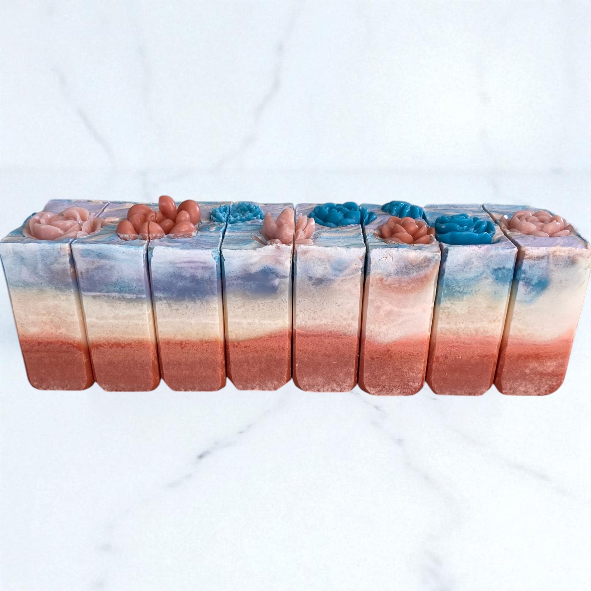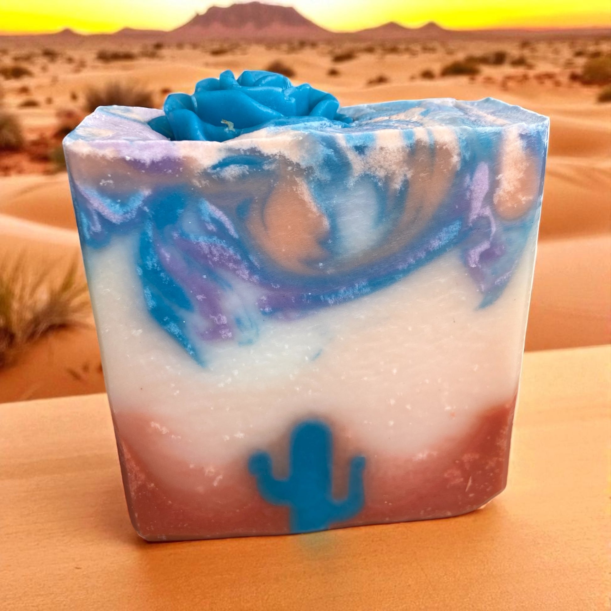 Breathe in the serene harmony of lavender, bright litsea, and grounding cedarwood with this desert-inspired artisan soap. The design features a bold turquoise cactus standing tall against coral and pink mountains, all beneath a sky swirled in deep blue and vibrant magenta. Handcrafted with nourishing oils, this bar captures the beauty of a desert sunset and the calm of nature’s wide-open skies.